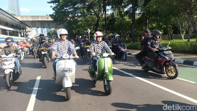 Anies terlihat mengendarai vespa berwarna abu-abu dengan helm putih. Sementara Cak Imin menggunakan motor vespa berwarna hijau dengan helm putih dengan motif garis merah hijau.