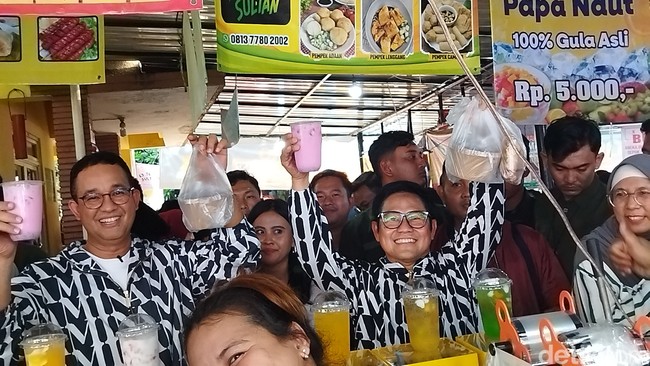 Anies-Cak Imin tampak berburu berbagai macam jajanan yang ada di Pasar Takjil Benhil. Keduanya terlihat banyak menenteng jajanan hasil 'war takjil', istilah yang menggambarkan kesibukan jajan berburu takjil favorit jelang buka puasa.