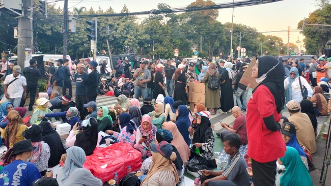 Massa yang tergabung dari beberapa komunitas tampak duduk bersama menyantap hidangan berbuka. Ada yang duduk beralaskan tikar, ada pula yang duduk di jalur pedestrian.