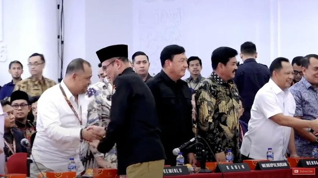 KPU RI mengumumkan rekapitulasi nasional pemilu 2024 malam ini. Dua menteri terlihat hadir yakni Mendagri Tito Karnavian dan Menko Polhukam Hadi Tjahjanto.