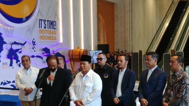 Presiden terpilih periode 2024-2029 Prabowo Subianto menyambangi Ketum Partai NasDem Surya Paloh di NasDem Tower, Jakarta. Prabowo berbicara tentang persahabatan lamanya dengan Surya Paloh.