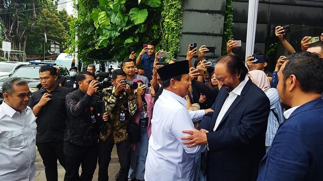 Presiden terpilih periode 2024-2029 Prabowo Subianto melakukan pertemuan dengan Ketua Umum Partai NasDem, Surya Paloh. Dalam kesempatan itu, Prabowo sempat ditanya apakah menawarkan Surya Paloh bergabung ke koalisinya.