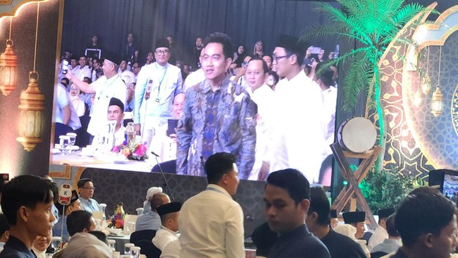 Gibran datang di tengah Prabowo sedang berpidato. Saat tiba di lokasi buka puasa bersama, Gibran bersalaman dengan tokoh yang lain yang hadir terlebih dahulu.