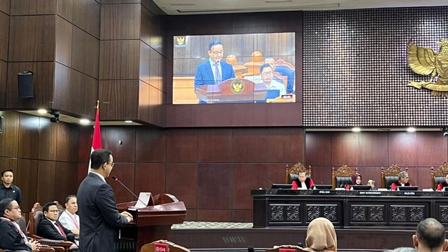 Anies Baswedan mengawali sidang sengketa hasil Pilpres 2024 di Mahkamah Konstitusi (MK). Anies menyebut tanggung jawab demokrasi Indonesia berada di pundak para hakim MK.