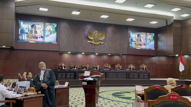 Tim hukum Anies Baswedan-Muhaimin Iskandar (Cak Imin) memutar video yang berisi tangkapan layar berita dan potongan video pernyataan Presiden Joko Widodo (Jokowi) soal Pemilu 2024 dalam sidang perdana sengketa Pilpres 2024. Ketua MK Suhartoyo sempat meminta video itu disetop.