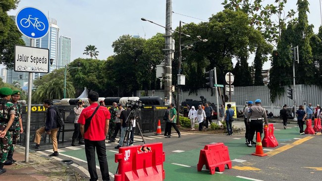 Pantauan detikcom di kantor KPU RI, Jalan Imam Bonjol, Jakarta Pusat, Rabu (24/4/2024) pukul 08.40 WIB, pengamanan di sekitar gedung KPU diperketat. Terlihat hanya ada satu gerbang yang dibuka untuk lalu lalang.