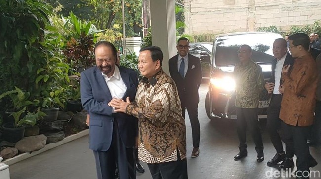 Prabowo mengenakan batik cokelat tampak menyambut kedatangan Paloh. Prabowo terlihat merangkul Surya Paloh.