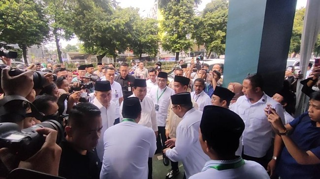 Prabowo kemudian datang pukul 13.22 WIB. Gibran, Gus Yahya, Gus Ipul hingga Menag Yaqut menyambut kehadirannya. Prabowo pun menyalami satu per satu jajaran PBNU di lokasi.