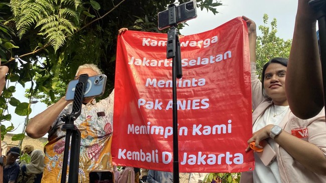 Spanduk bertuliskan 'Kami Warga Jakarta Selatan Meminta Pak Anies Memimpin Kami Kembali di Jakarta' itu berwarna merah. Spanduk ini kemudian dibentangkan di kediaman Anies.
