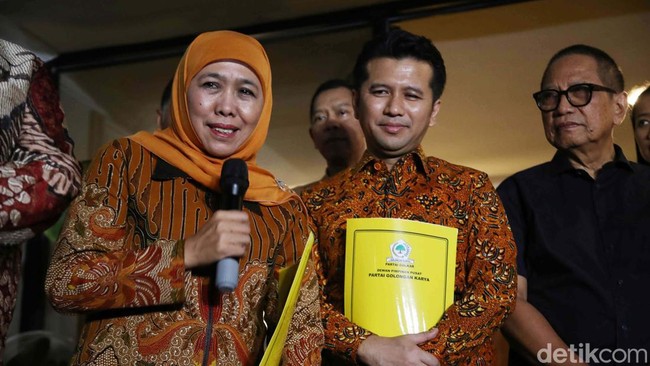 Mantan Gubernur Jawa Timur (Jatim) Khofifah Indar Parawansa dan mantan Wagub Jatim Emil Dardak resmi mendapat dukungan dari Partai Golkar untuk Pilgub Jatim 2024. Khofifah mengapresiasi dukungan Golkar tersebut.