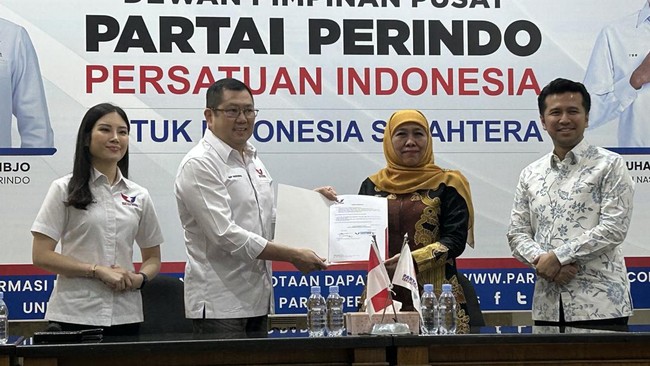 Partai Perindo resmi mengusung Khofifah Indar Parawansa dan Emil Dardak sebagai Cagub dan Cawagub dalam Pilgub Jawa Timur (Jatim) 2024. Khofifah dan Emil hadir langsung saat deklarasi.