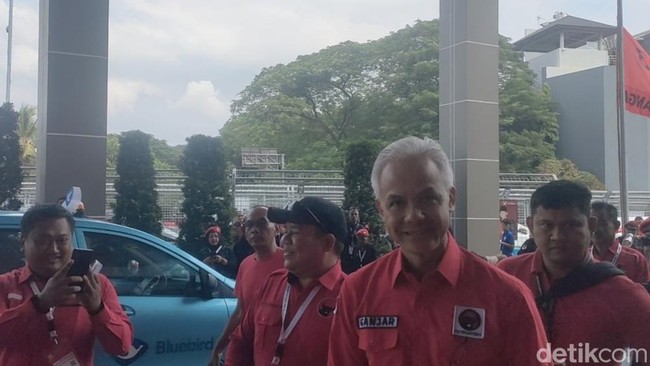 Pantauan detikcom dalam acara Rakernas di Beach City International Stadium, Jakarta Utara, Jumat (24/5/2024), Ganjar tiba pukul 13.27 WIB. Ia mengenakan seragam merah partai sambil membawa lembaran kertas bergambar Ketum Megawati Soekarnoputri dan Presiden RI pertama Soekarno.