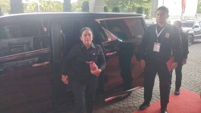 Setelah itu pukul 13.58 Ketua DPP PDIP Puan Maharani tampak di area Rakernas. Puan mengenakan seragam hitam PDIP, ia terlihat menyapa jajaran kader.