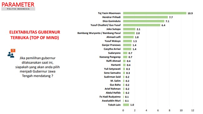 Lembaga survei Parameter Politik Indonesia (PPI) merilis hasil survei elektabilitas cagub di Pilkada 2024. Hasilnya tiga besar top of mind elektabilitas cagub diisi nama Taj Yasin Maimoen, Hendrar Prihadi (Hendi) dan Dico Ganinduto.