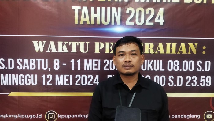 "Vermin ini merupakan tahapan verifikasi administrasi, berkaitan dengan dokumen dukungan minimal dari bakal calon bupati perseorangan. Tercatat yang masuk ada dua pasangan yang memenuhi syarat. Ada pasangan Pak Haji Aap dan Qomar. Dan Pak Uday Syuhada dengan Pujianto," kata Ketua Divisi Teknis Penyelanggara Pemilu KPU Pandeglang, Restu Sugrining Umam, kepada wartawan di kantor KPU Pandeglang, Rabu (29/5/2024).