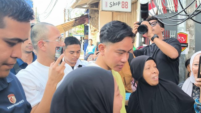 Wakil presiden terpilih Gibran Rakabuming Raka blusukan ke kawasan kampung padat, Pasar Manggis, Jakarta Selatan. Gibran membagikan buku dan susu gratis kepada warga.