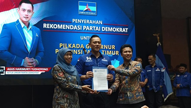 Ketua Umum Partai Demokrat Agus Harimurti Yudhoyono (AHY) menyerahkan langsung surat rekomendasi kepada 6 bakal calon gubernur dan wakil gubernur untuk Pilkada serentak 2024 mendatang. Salah satunya ialah paslon gubernur dan wakil gubernur Jawa Timur Khofifah Indar Parawansa dan Emil Dardak.