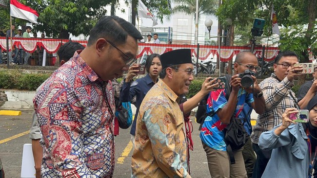 Pantauan detikcom di kantor DPP Gerindra, Ragunan, Jakarta, Jumat (23/8/2024), Suswono terlihat tiba lebih awal, lalu disusul oleh kedatangan RK. Keduanya kompak mengenakan kemeja batik, RK bernuansa merah, sementara Suswono warna cokelat kekuningan.
