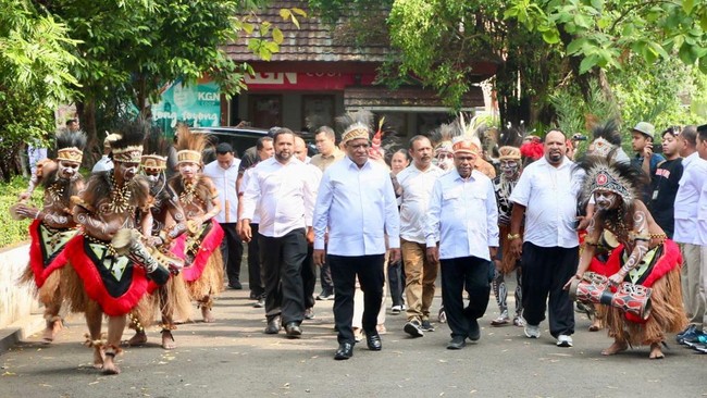 Wakil Menteri Dalam Negeri (Wamendagri) John Wempi Wetipo tiba di Kantor Dewan Pengurus Pusat (DPP) Partai Gerakan Indonesia Raya (Gerindra) di Jakarta, hari ini. Kedatangannya disambut meriah tarian adat Papua, menciptakan suasana yang kental dengan nuansa budaya dan semangat persatuan.