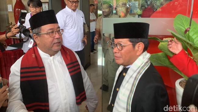 Pantauan detikcom, Rabu (28/8/2024), Pramono tiba di PDIP pukul 10.00 WIB. Dia tampak mengenakan peci hitam dan stelan beskap Betawi dengan atasan hitam.