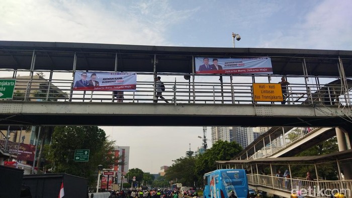 Pantauan detikcom di depan kantor KPU DKI Jakarta, Rabu (28/8/2024), spanduk RK-Suswono terlihat di pagar pembatas Jalan Salemba Raya. Selain itu, spanduk RK-Suswono juga mejeng di jembatan penyeberangan orang (JPO) Halte Transjakarta Salemba.