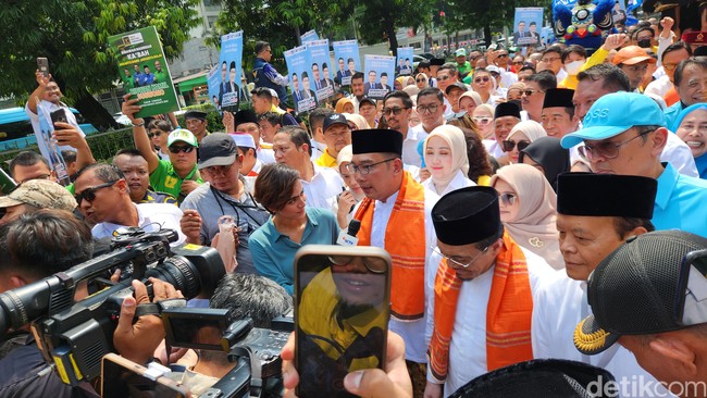 Pantauan detikcom, di KPU DKI, Jakarta Pusat, Rabu (28/8/2024), RK-Suswono tiba pada pukul 13.56 WIB. RK-Suswono terlihat diantar oleh jajaran partai politik Koalisi Indonesia Maju (KIM) Plus sebagai parpol pendukungnya.