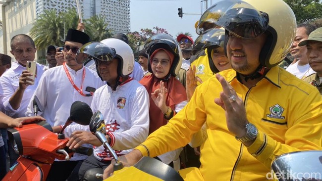 Pantauan detikcom di KPU Depok, Jalan Margonda Raya, Kamis (29/8/2024), pukul 10.21 WIB, Tampak Imam-Ririn datang ke KPU menggunakan vesmet. Mereka berboncengan dengan pasangan masing-masing.
