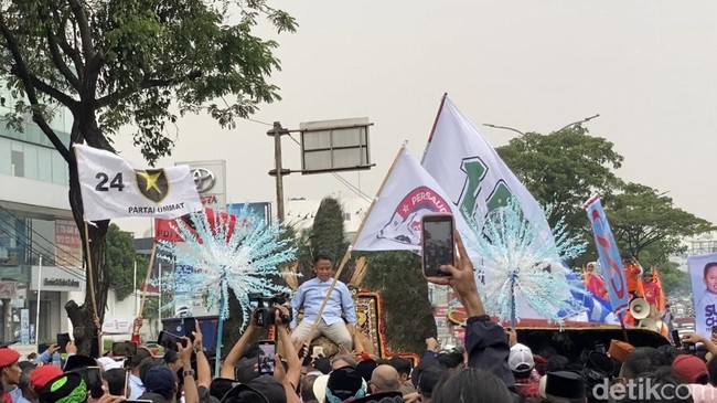 Tampak ribuan pendukung juga membawa berbagai bendera partai. Tampak ada 12 bendera partai yakni, Gerindra, PDIP, Demokrat, PKB, PAN, PPP, NasDem, Perindo, Gelora, Partai Ummat dan Partai Buruh dan PSI.