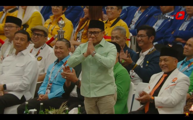 Seisi arena hajatan Gerindra ini bergemuruh menyambut Cak Imin. Cak Imin kemudian menjura dan tersenyum menyambut sapaan Prabowo dan para hadirin.