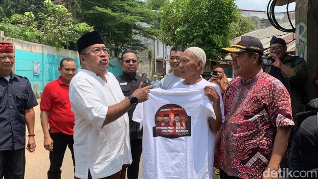 Pantauan detikcom, Selasa (2/9/2024) Rano Karno tiba dengan mengenakan pakaian putih dan celana khas Betawi. Setiba di lokasi, pemeran Si Doel itu diberi kaus bertuliskan 'Mas Pram Bang Doel' di bagian belakang dan 'Jakarta Menyala' di sisi depan.