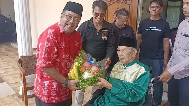Bakal cawagub Jakarta PDIP, Rano Karno, menyambangi kediaman eks Wagub DKI Jakarta, Mayjen TNI (Purn) Eddie Marzuki Nalapraya, di Megamendung, Kabupaten Bogor, Jawa Barat. Bersama rombongan, Rano Karno mengenakan pakaian warna merah.