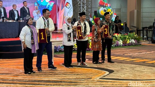 "Pasangan Khofifah-Emil mendapat kesempatan pertama mengambil nomor urut. Kemudian Risma-Gus Hans kedua, dan Luluk-Lukman ketiga," kata Ketua KPU Jatim Aang Kunaefi di Hotel Mercure Mirama Surabaya, dilansir detikJatim, Senin (23/9/2024).