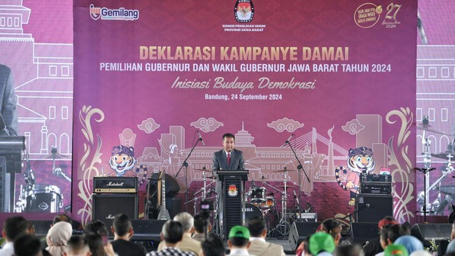 Penjabat (Pj.) Gubernur Jawa Barat (Jabar) Bey Machmudin mendeklarasikan Damai Pemilihan Gubernur dan Wakil Gubernur Jawa Barat Tahun 2024 di Laswi Heritage, Kota Bandung. Hal ini ditandai dengan penandatanganan Deklarasi Damai, bersama pasangan calon gubernur dan wakil gubernur Jabar.