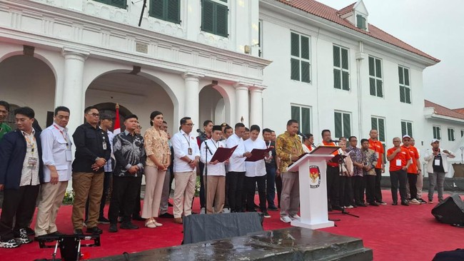 Pantauan detikcom di Kota Tua, Jakarta pada Rabu (24/9/2024), paslon nomor urut 1, Ridwan Kamil-Suswono, paslon nomor urut 2 Dharma-Kun, dan Paslon nomor urut 3 Pramono-Rano Karno membacakan deklarasi yang dipimpin oleh Ketua KPU DKI Wahyu Dinata.