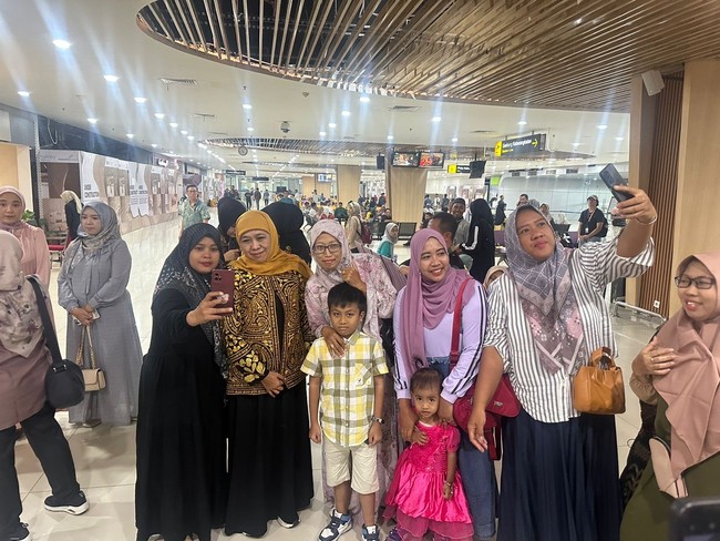 Di sela-sela mengantar Yusuf, Khofifah menjadi rebutan foto para penumpang yang sedang menunggu penerbangan. Khofifah diharapkan bisa memimpin Jawa Timur kembali untuk periode kedua.