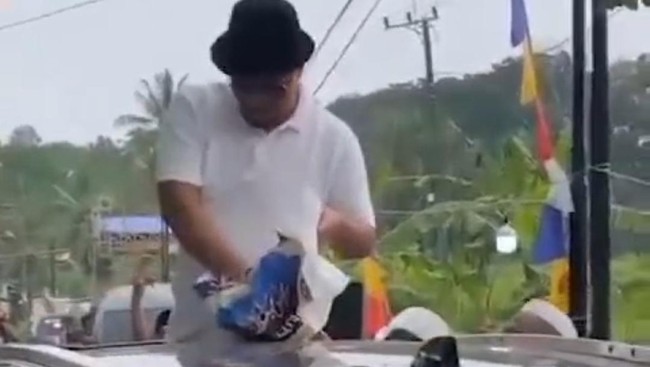 Diketahui sebelumnya, aksi seorang pria membagikan. Dalam video yang beredar, tampak seorang pria mengenakan baju putih dan topi hitam, membagikan uang ke warga sekitar di atas sunroof mobilnya.