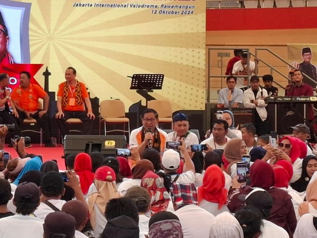 Pasangan Calon Gubernur DKI Jakarta nomor urut 3 Pramono Anung-Rano Karno bertemu dengan ribuan relawan di Jakarta Internasional Velodrome, Jakarta Timur. Pramono berpesan kepada relawannya agar tak takabur dan tetap fokus pada pemenangan di Pilkada 2024.