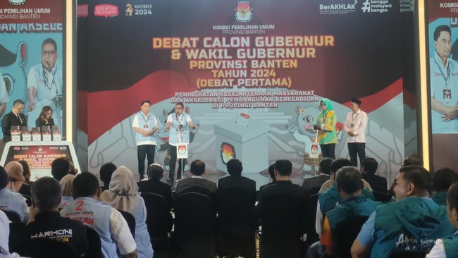 Debat perdana ini digelar di Auditorium Menara Bank Mega, Kompleks Transmedia, Jakarta Selatan, Rabu (16/10/2024) malam. Moderator mulanya menyampaikan data kemiskinan di wilayah Banten.