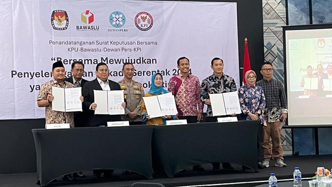 Penandatanganan surat keputusan bersama (SKB) bertajuk 'Bersama Mewujudkan Penyelenggaraan Pilkada Serentak 2024 yang Jujur, Adil dan Demokratis' itu dilakukan di Kantor Dewan Pers, Jakarta Pusat, Selasa (22/10/2024).