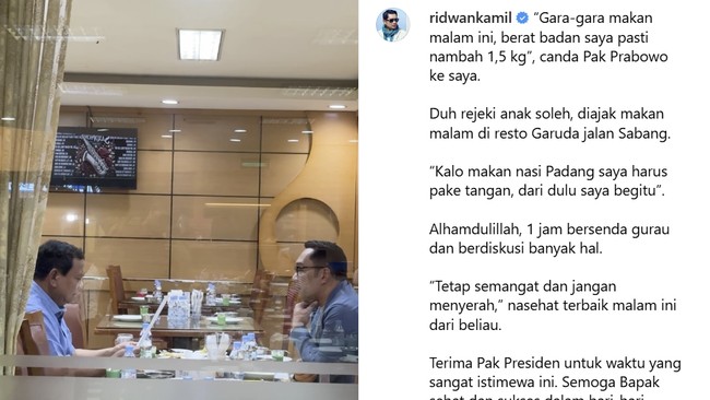 Dalam unggahan video di akun Instagram RK, Kamis (31/10/2024), eks Gubernur Jawa Barat (Jabar) itu mengatakan Prabowo sempat melempar guyon soal kekhawatiran berat badannya naik usai makan malam bersama RK. RK mengatakan makan malam tersebut berlangsung di sebuah restoran, Sabang, Jakarta Pusat.
