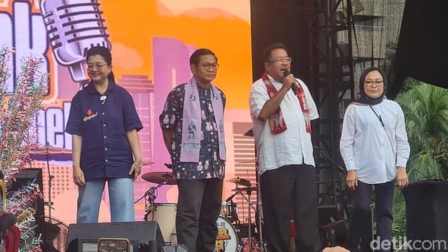 Acara ini bertajuk 'Ngerujak Bareng Mas Pram-Bang Doel dan Konser Jakarta Menyala'. Pantauan di lokasi, massa pendukung dan kelompok relawan Pram-Rano yang didominasi kelompok ibu-ibu memadati venue di Parkir Timur Senayan, Gelora Bung Karno, Jakarta Pusat, Senin (4/11/2024).