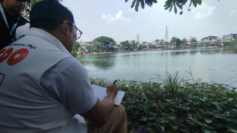 RK kemudian lanjut berkeliling Tanah Merah hingga akhirnya tiba di salah satu lahan kosong yang saat ini digenangi air hingga membentuk kolam. RK kemudian berhenti dan mengambil kertas serta pulpen.
