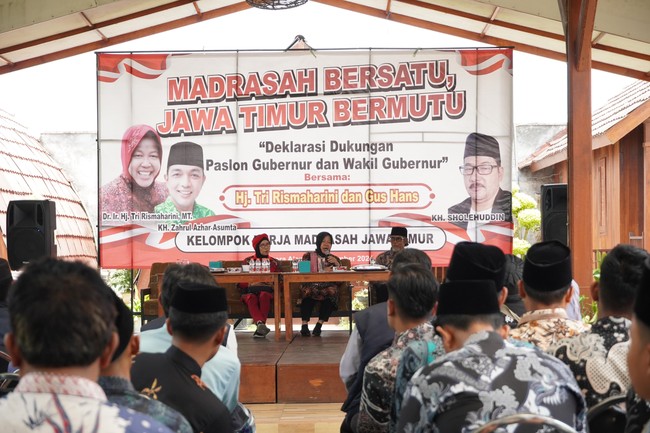 Kelompok Kerja Madrasah (KKM) Provinsi Jawa Timur resmi mendeklarasikan dukungan kepada Pasangan Calon (Paslon) Gubernur dan Wakil Gubernur Jawa Timur nomor urut 3 Tri Rismaharini-KH Zahrul Azhar Asumta (Gus Hans).
