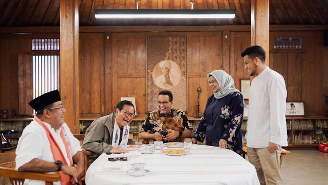"Pagi ini, menyongsong terbitnya matahari, ngobrol soal kota Jakarta dan masa depannya dengan Mas @pramonoanungw dan Bang @si.rano di rumah. Ditemani lontong sayur dan kopi buatan @fery.farhati, bikin percakapan makin hangat dan menyenangkan," tulis Anies.