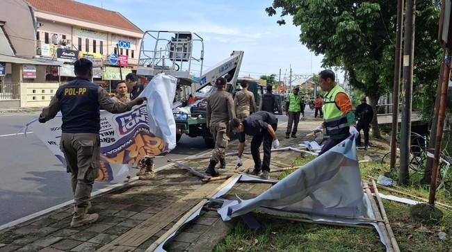 Petugas gabungan membersihkan Alat Peraga Kampanye (APK) pemilihan kepala daerah (pilkada) di Kota Bogor. Penertiban dilakukan karena sudah memasuki tahapan masa tenang jelang pemungutan suara 27 November mendatang.