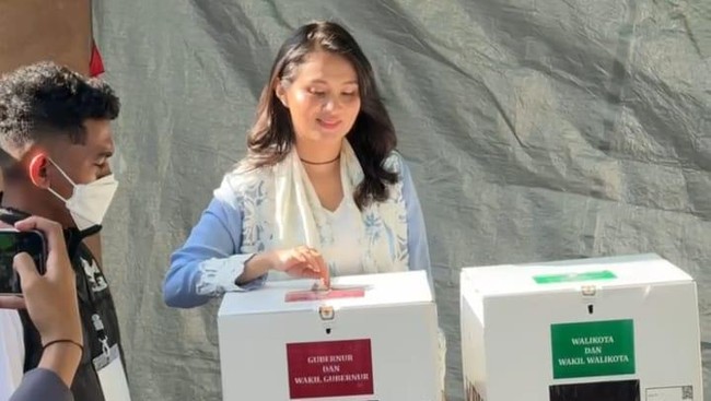 Calon Gubernur Maluku Utara (Malut) nomor urut 4, Sherly Tjoanda menggunakan hak suaranya dalam Pilkada serentak 2024 di Kota Ternate. Sherly menjadi cagub karena menggantikan suaminya, Benny Laos yang meninggal dalam kecelakaan speedboat di Pulau Taliabu.