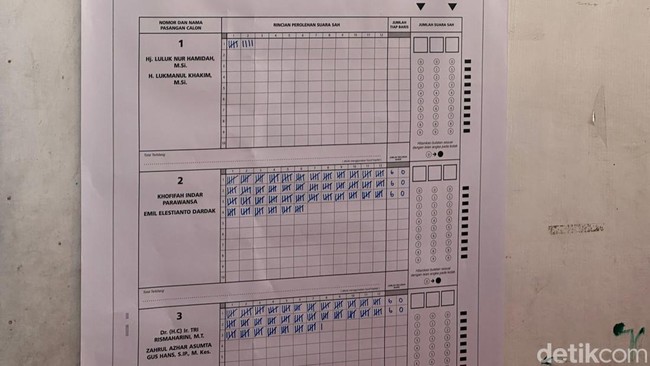 Pantauan di lokasi, Rabu (27/11/2024), Khofifah-Emil meraih suara sebanyak 210. Kemudian paslon nomor urut 3, Tri Rismaharini (Risma)-KH Zahrul Azhar Asumta (Gus Hans) meraih 156 suara.