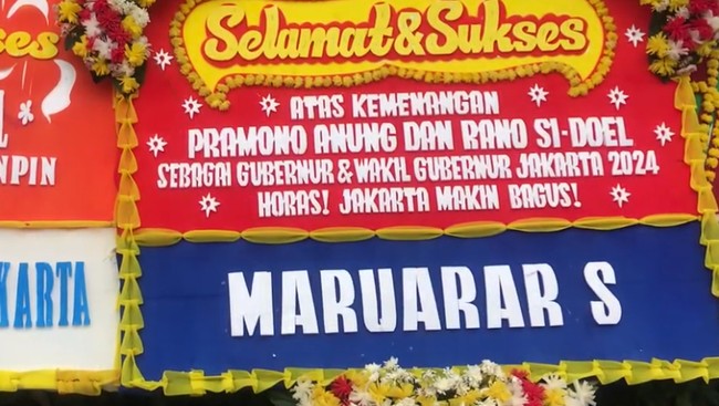 Karangan bunga tersebut terpajang di rumah pemenganan Pramono-Rano sejak Jumat (29/11) yang lalu. Karangan bunga itu bertuliskan, 'Selamat & sukses atas kemenangan Pramono Anung dan Rano Si Doel sebagai gubernur dan wakil gubernur Jakarta 2024. Horas! Jakarta Makin Bagus!'