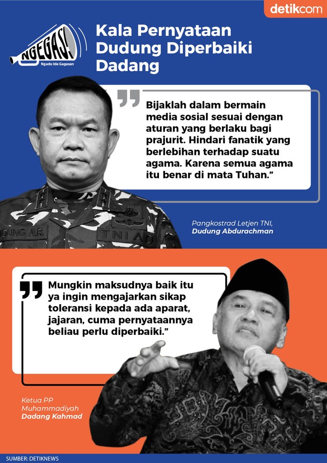 Jakarta - Pangkostrad Letjen Dudung Abdurachman berpesan kepada prajurit agar tidak fanatik dalam beragama. Dia menilai semua agama benar di mata Tuhan. Namun, Ketua PP Muhammadiyah Dadang Kahmad menilai pernyataan Dudung perlu diperbaiki.