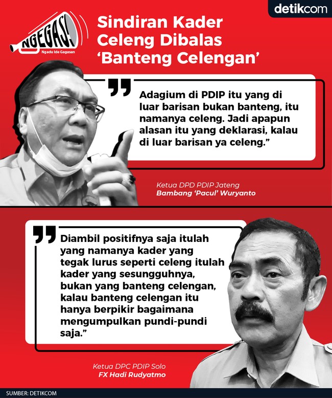 Ngegas! Ngadu Ide Gagasan Sindiran Kader Celeng Dibalas 'Banteng Celengan' Tim detikcom - detikNews Sabtu, 16 Okt 2021 06:02 WIB BAGIKAN Komentar Foto: Sindiran Kader Celeng Dibalas 'Banteng Celengan' (Tim Infografis detikcom) Jakarta - Ketua DPD PDIP Jateng Bambang 'Pacul' Wuryanto menyindir soal barisan celeng di balik dukungan terhadap Ganjar Pranowo. Ketua DPC PDIP Solo FX Hadi Rudyatmo justru menganggap sindiran ini sebagai hal yang positif saja.Kamu dukung siapa? (rdp/rdp) celeng pdip fx rudy fx rudi hadyatmo bambang pacul ngegas BAGIKAN Komentar